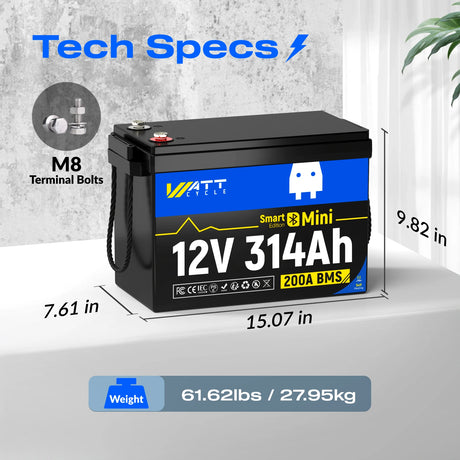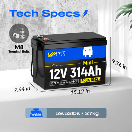 Batteries arrived in good shape & well packed. Came with short & longer bolts which was helpful. I installed 4 of them in a boat as the primary house side. They replace 4 each 210 AHr AGM batteries that were half again bigger and twice as heavy (120 lbs each) as these ~60 lb 314 AHr LifePO4 batteries. This tripled my house capacity & removed 240 lbs of the weight. I added 250A MRBF Fuses to each +positive battery, as well as a 350A Class-T fuse on the overall DC+ side. Additionally, I added a Victron 500A Waterproof SmartShunt to monitor the charge/discharge levels. For charging, I added a Victron Orion XS 50A DC to DC charger for the alternator, and a 40A LifePO4 AC to DC Charger with a remotely activated plug. So far, the batteries seem to be working as advertised.