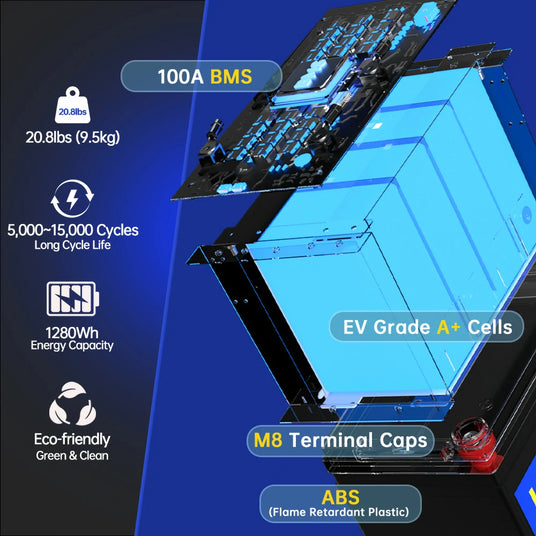 - Safer 100A BMS Protection: 21+ protections (overcharge, over-discharge, overcurrent, over-heating & short circuits)