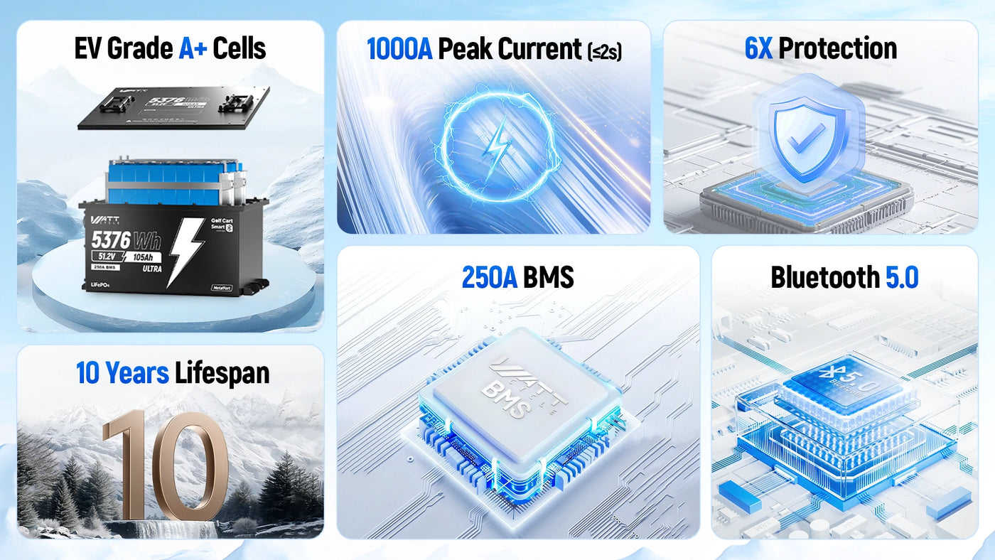 Upgrade your ride with a drop-in 48v lithium golf cart battery that fits standard trays and replaces six 8V 100Ah lead-acid units with no modifications. Delivering up to 70+ miles on a single charge, the WattCycle 51.2V 105Ah battery delivers 250A continuous current, built-in Bluetooth monitoring, and IP65 protection to give stronger hill performance, reliable cold-weather operation, and a lighter, more compact power solution.