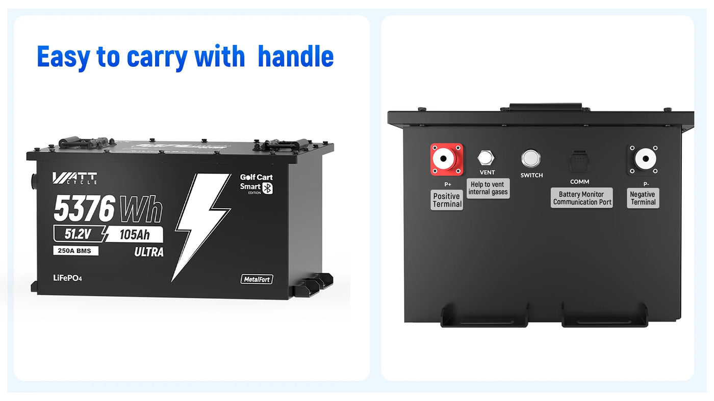The WattCycle 51.2V 105Ah LiFePO4 battery directly replaces six 8V 100Ah lead-acid batteries with no tray modification. Battery tray bases match, wiring is straightforward, and installation does not require complicated changes. For owners switching from lead-acid to lithium, this is the simplest swap.
