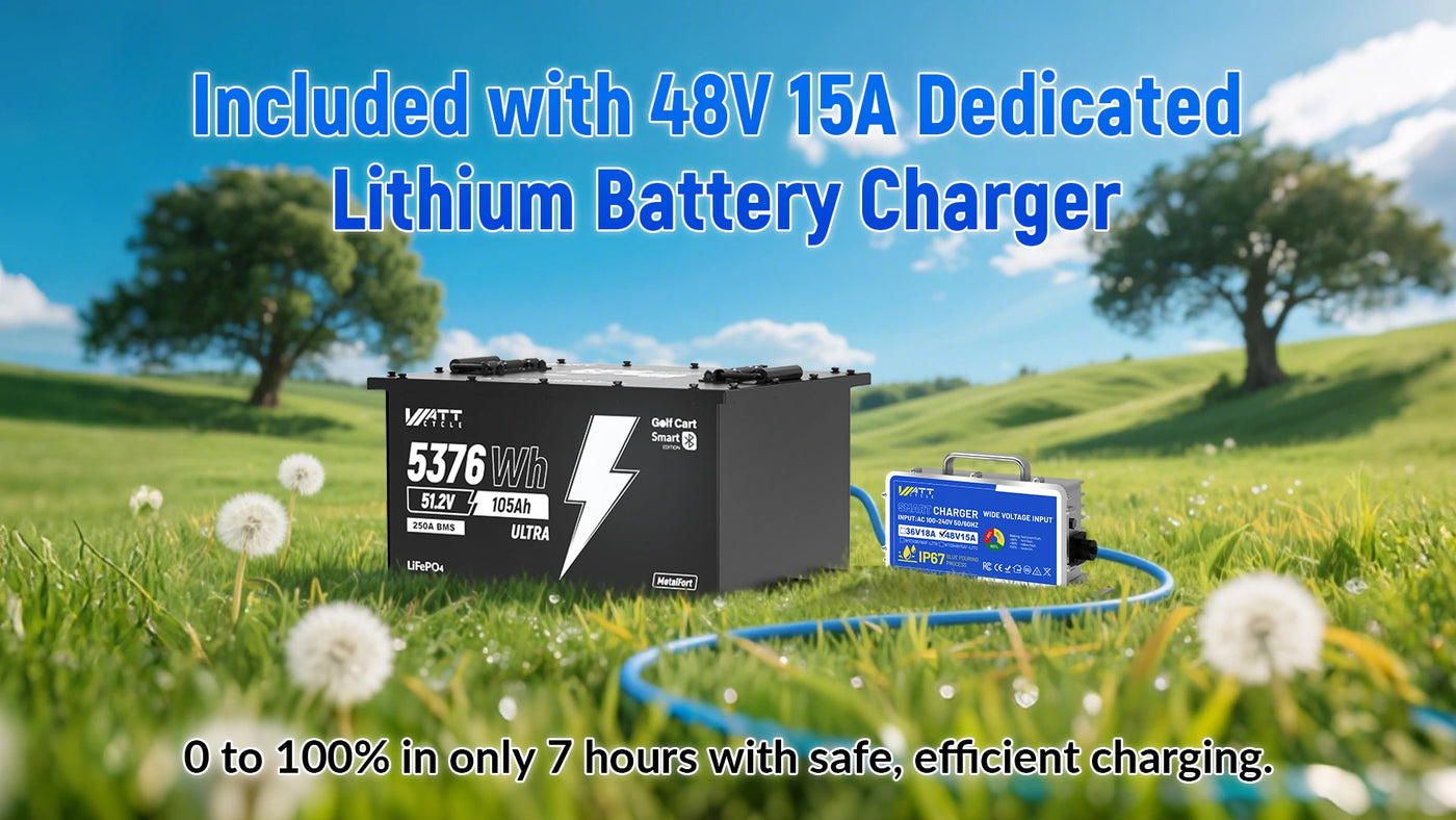 - Fast Charging: 7 hours to a full charge with the WattCycle dedicated 51.2V 15A lithium charger, also compatible with solar panels and generators.