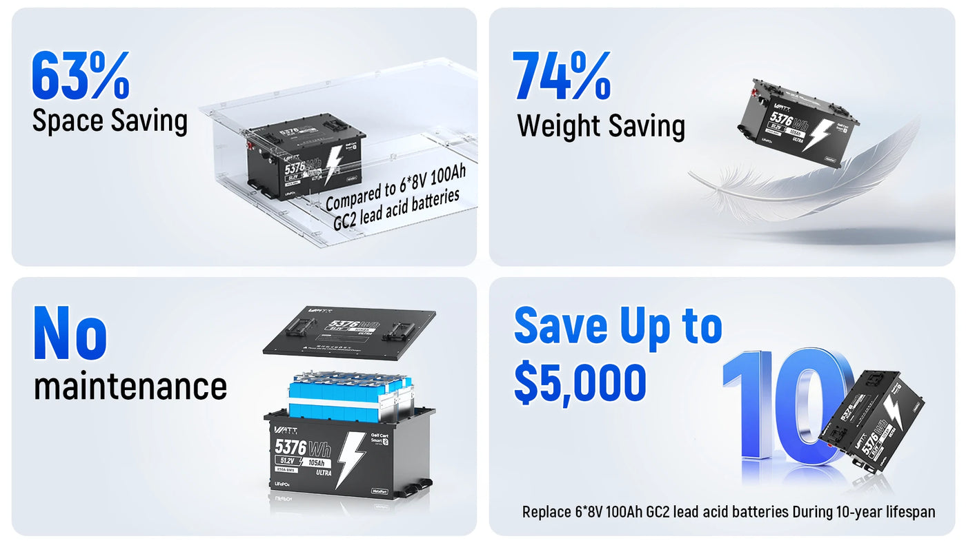 Replacing a conventional 48V lead-acid bank yields about 63% space savings and roughly 74% weight reduction. The smaller, lighter battery reduces vehicle weight and improves overall efficiency while making installation and maintenance easier.