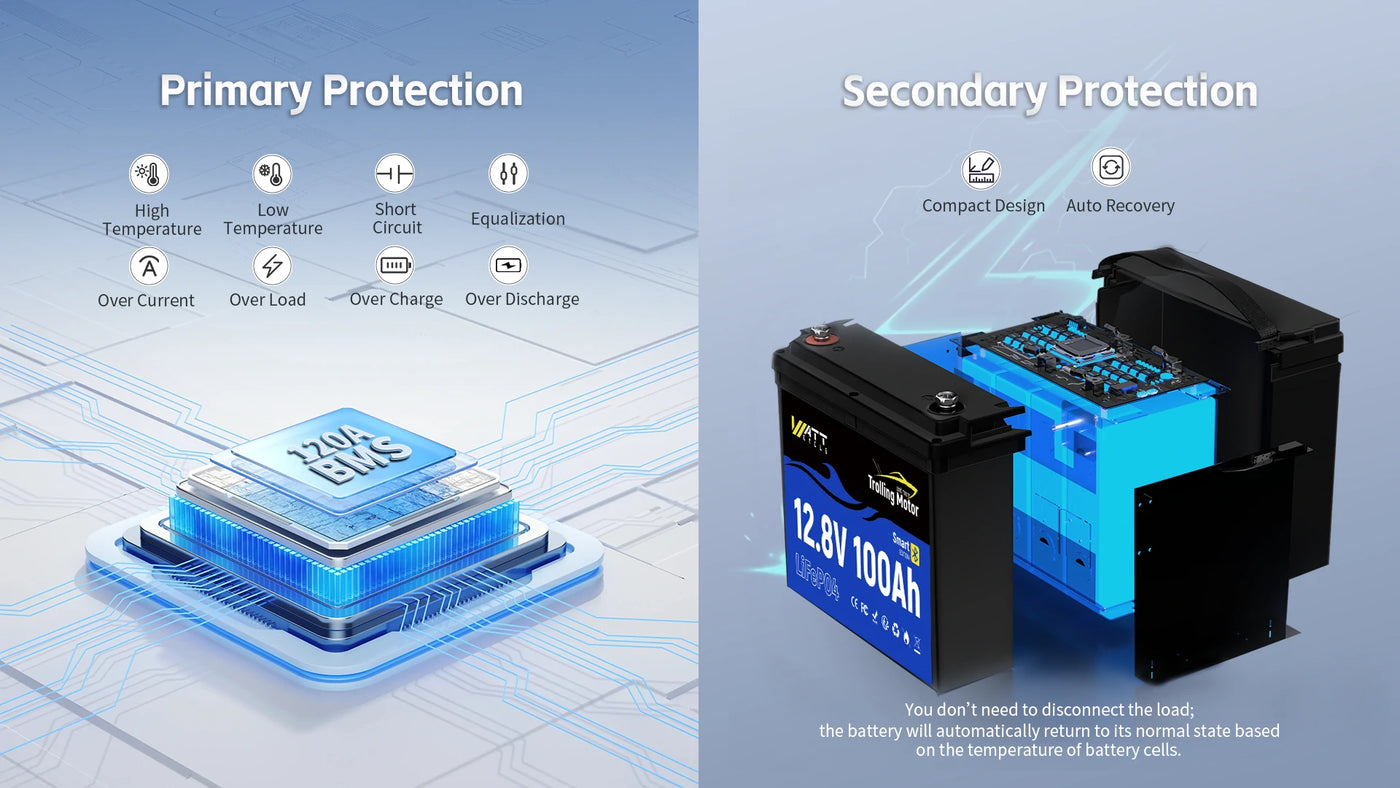 The WattCycle 12V 100Ah LiFePO4 trolling motor Battery features an advanced 120A Battery Management System (BMS), enabling a continuous 120A output to deliver exceptional performance for trolling motors and other high-power devices.