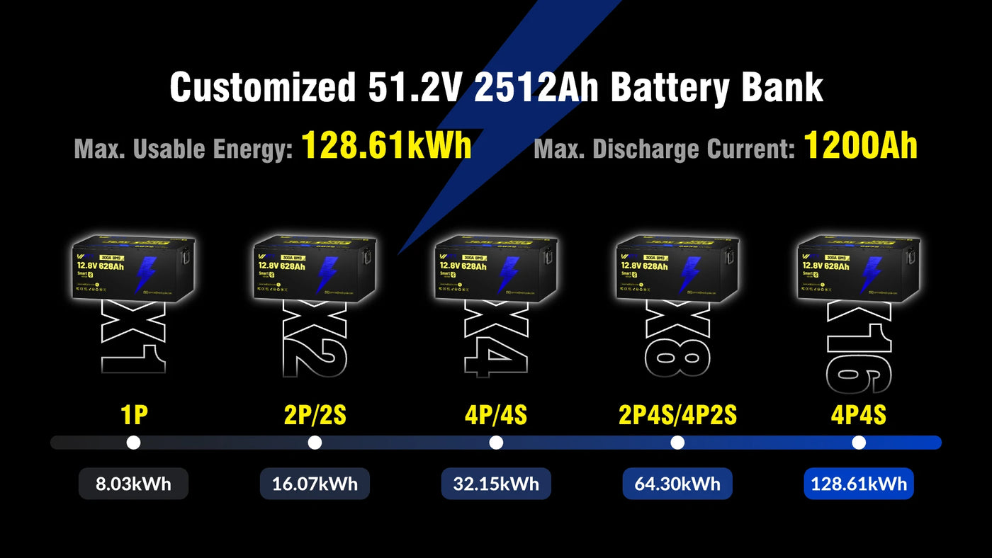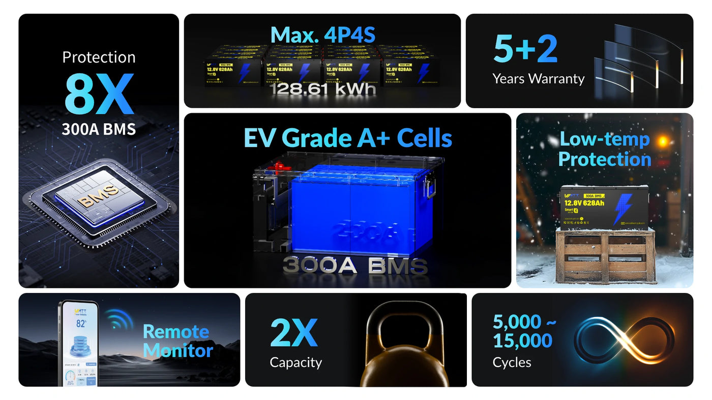 - Voltage: 12.8V / Capacity: 628Ah / Energy: 8038.4Wh