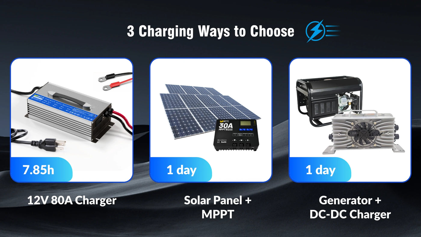Use the WattCycle 14.6 V 80 A charger specifically designed for LiFePO4 battery, which fully charges the battery in just 7.85 hours. With a faster charging rate than traditional lead-acid batteries it provides a better using experience. In addition, 3 other charging options, including solar panel, alternator and generator, suit your different charging needs.
