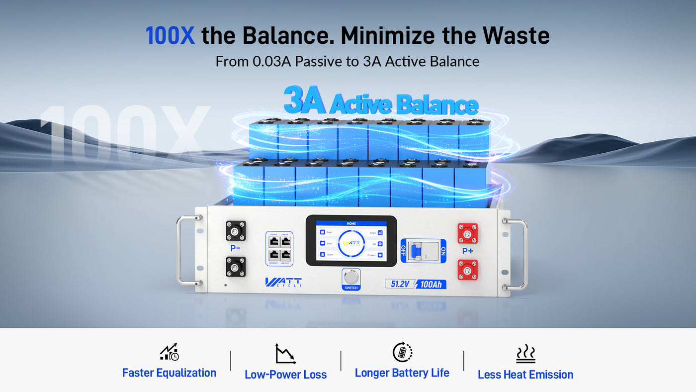 WattCycle's active balancing function effectively protects battery cells, improves safety, extends battery pack life, and increases capacity utilization. Ultra-high 3A balancing current: Faster balancing speed, better balancing effect, and better adaptation to large-capacity battery cells.