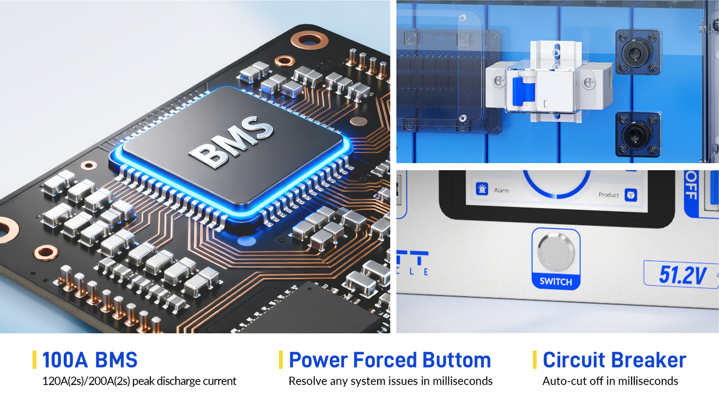 Power button and short-circuit valve – one switch handles all emergencies, giving your battery a dual boost of emergency and flexibility! Powerful BMS chip automatically cuts off faults in seconds, promptly responding to short circuits, overloads, and other situations, suitable for safe use in high-power devices.