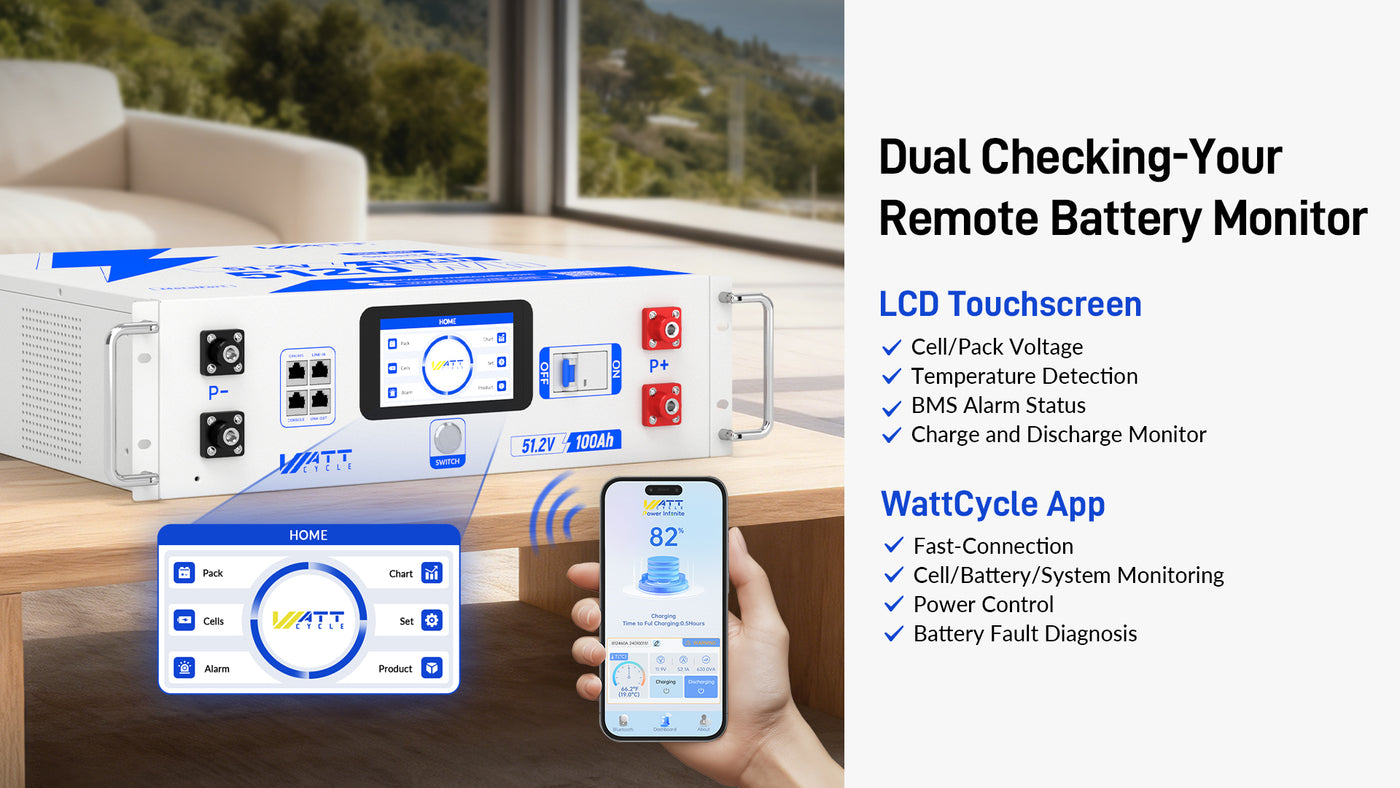 WattCycle 48V 100Ah 3U rack battery supports remote control via a mobile app, and the battery itself features an LCD touchscreen, helping you monitor your battery status in real time.