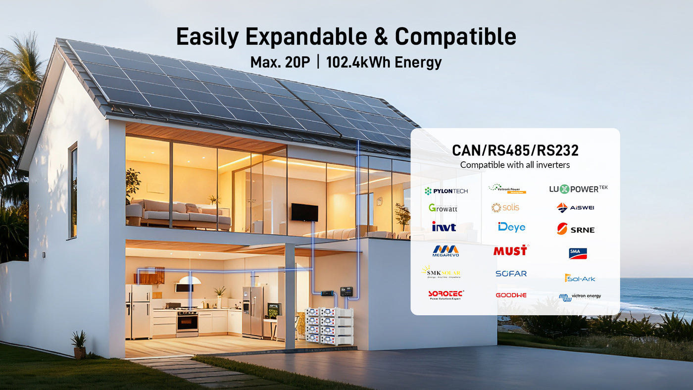 WattCycle 48V 100Ah 3U rack lithium battery can be easily expanded to 20 batteries (automatic addressing). Seamless insertion into the 3U rack makes it simple and convenient. Its CAN/RS485/RS232 is compatible with various inverter brands on the market, easily adapting to multiple scenarios, with strong anti-electromagnetic interference capabilities and millisecond-level command interaction.