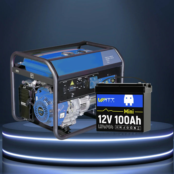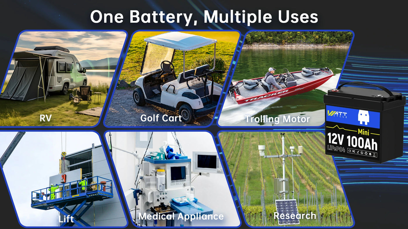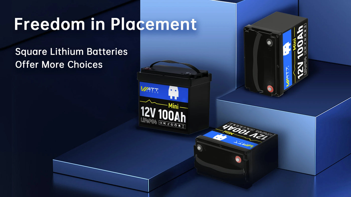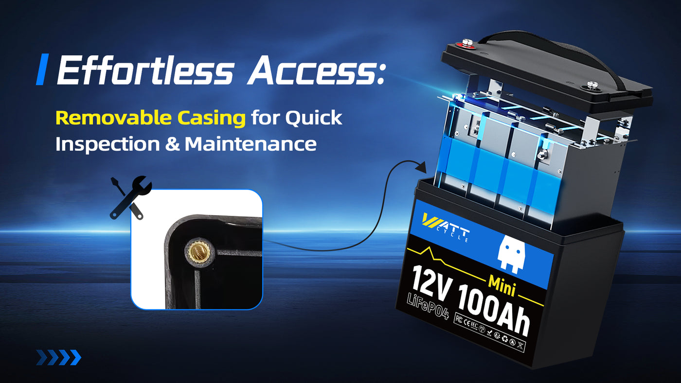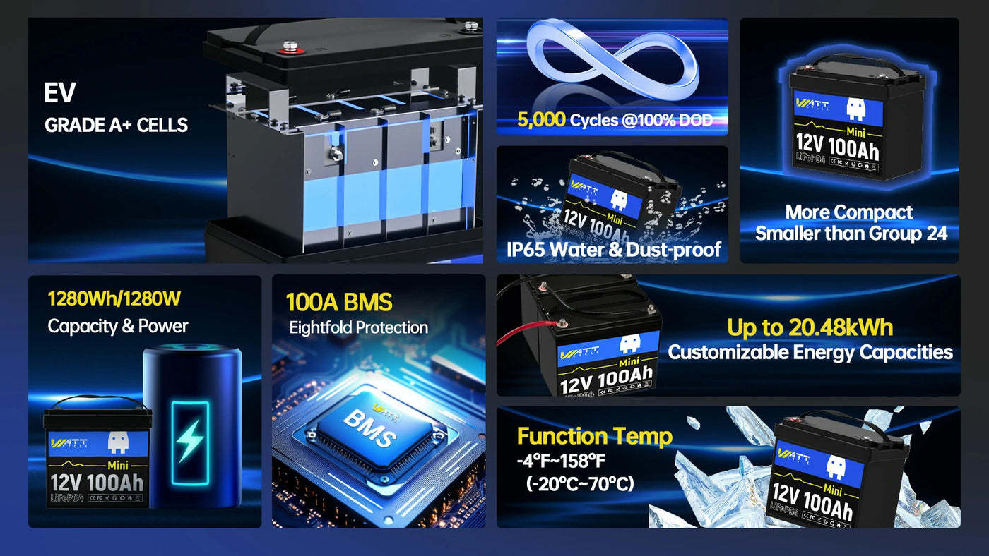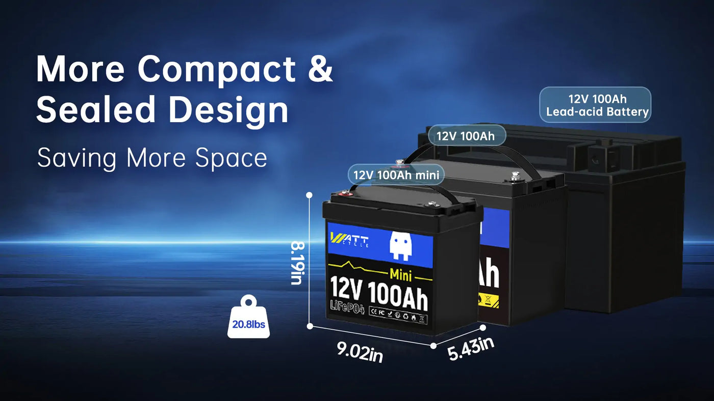 And the size of a WattCycle 12V 100Ah MINI LiFePO4 Battery is about 9.01″ (L) x 5.14″ (W) x 8.18″ (H).