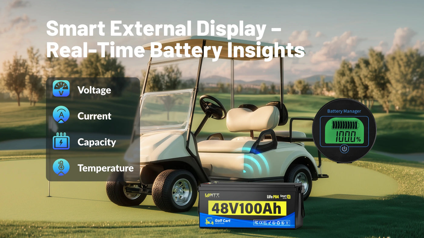 The WattCycle 48 volt golf cart batteries offers two highly convenient monitoring methods to keep you in complete control of your power system. A WattCycle Bluetooth APP allows you to effortlessly track real-time metrics such as voltage, current, and temperature directly from your smartphone. Get your Bluetooth guide. Complementing this, an advanced LCD monitor displays critical performance data at a glance, so you can always have an accurate overview of your battery's status. This dual-monitoring system makes managing your 48 volt golf cart battery system simple and efficient, ensuring optimum performance and continuous peace of mind.