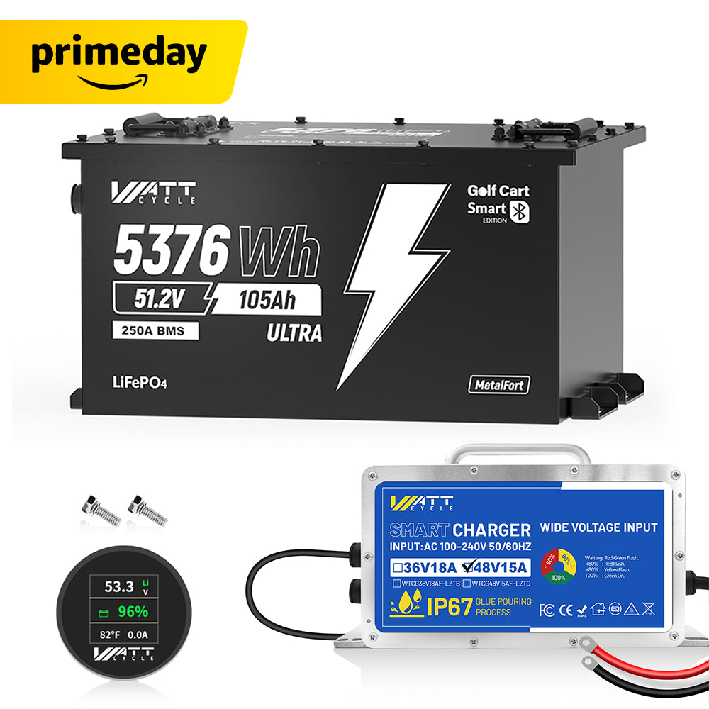Upgrade your ride with a drop-in 48v lithium golf cart battery that fits standard trays and replaces six 8V 100Ah lead-acid units with no modifications. Delivering up to 70+ miles on a single charge, the WattCycle 51.2V 105Ah battery delivers 250A continuous current, built-in Bluetooth monitoring, and IP65 protection to give stronger hill performance, reliable cold-weather operation, and a lighter, more compact power solution.