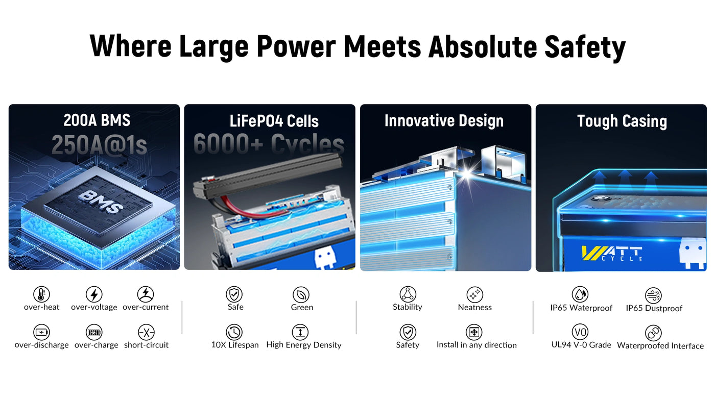 WattCycle lithium batteries offer absolutely safe battery performance. A 200A BMS with over 20 protections and a 250A(1s) peak discharge current allow you to use high-power appliances with peace of mind. It also features an innovative design with an internal metal frame and external tough casing, effectively reducing battery swelling, maintaining cell stability, and allowing for installation and use in any orientation.