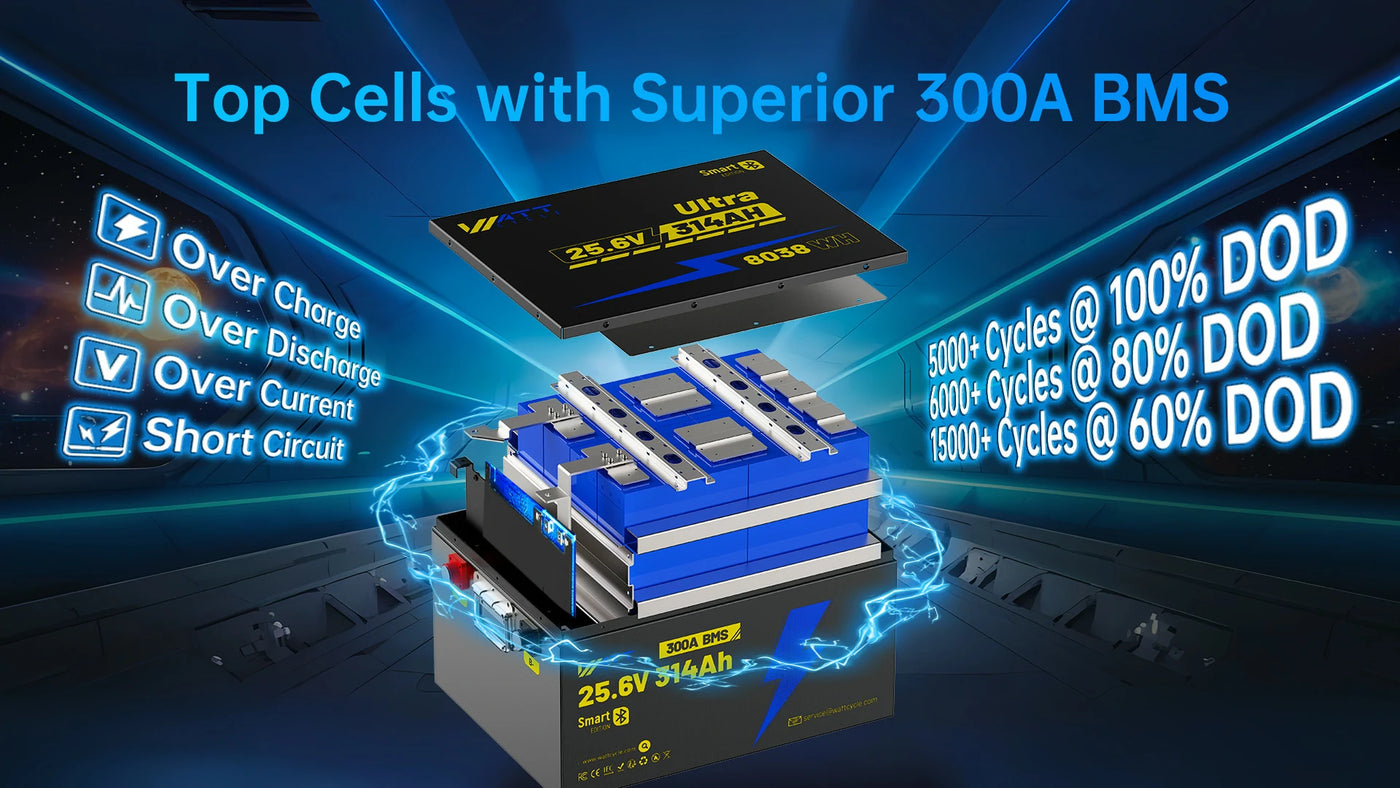 Under the hood, WattCycle use EV Grade A+ cells form the backbone of our 24V 314Ah LiFePO4 Battery, paired with a 300 A BMS that shields against over-current, short-circuit, over-charge and over-discharge events. You’ll enjoy up to 15 000 cycles and a decade-long service life—far beyond typical LiFePO4 modules. A solid aluminum frame and rugged ABS+PC casing (UL94 V‑0 rated) complete the military-grade build.