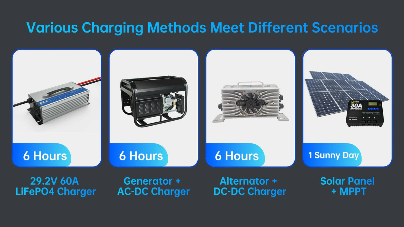 Power back up in hours, not days. Our dedicated 29.2 V, 60 A charger brings your battery to full in just six hours. Prefer solar? Pair with an MPPT controller and a suitably sized panel for recharging in roughly one daylight cycle. Generator plus AC-DC charger and alternator plus DC-DC converter each refill in six hours, giving you choice and resilience in any location.