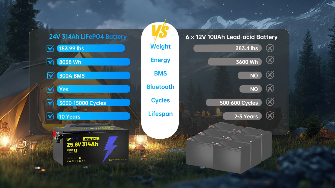WattCycle 24V 314Ah Ultra Lithium Battery cuts weight by more than half while offering over 15% more energy and 3× the cycle life. Its consistent power output and sustained depth of discharge ensure you won’t be sidelined by sudden voltage sag or premature capacity loss. Upgrade to this 24V 314Ah Lithium Battery and feel the difference in performance and durability.