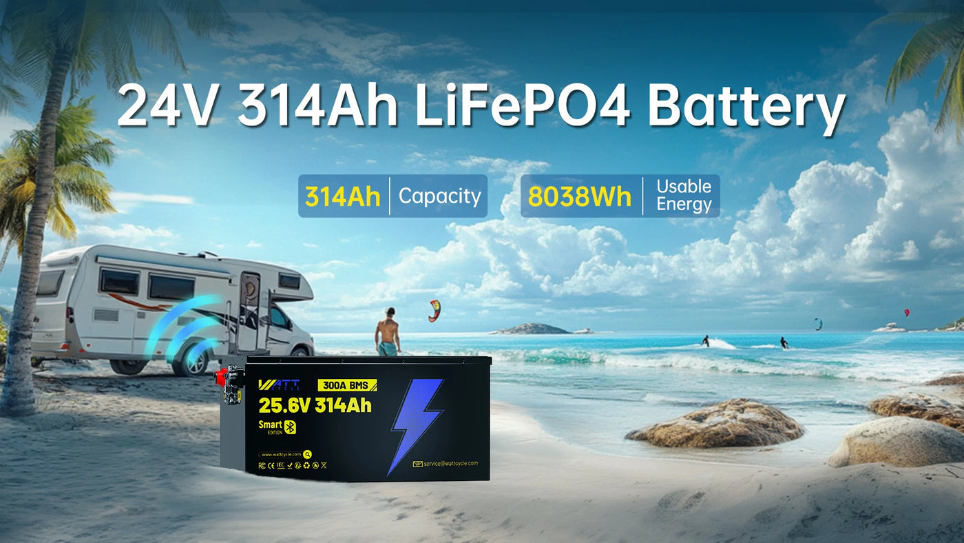 - Experience exceptional power with our 24V 314Ah LiFePO4 battery, delivering a substantial 8.03 kWh of usable energy (8038Wh).