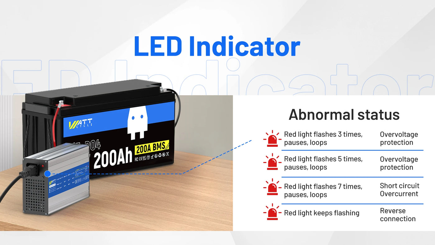 This product does not use a LED display. WattCycle charger is designed with a light-up alert function, blinking red (abnormal status) to activate over-temperature/short-circuit/reverse polarity protection/over-power protection, green color is always on when it's fully charged, and red color is always on when it's charging. You can judge the status of the battery and charger according to the lighted status, and pay attention to whether the battery is full or whether there is any abnormality in time.